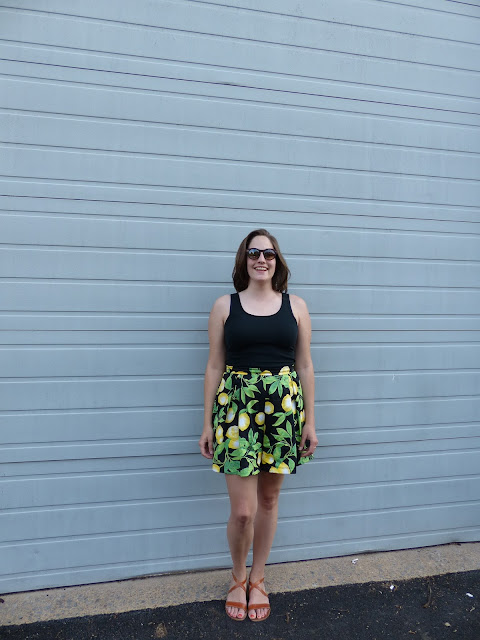 I'm really loving wearing this dress! The swingy-factor makes this one fun to twirl in and super easy to wear (dress up or down! eat a huge meal! sit in a car or at your desk for hours!). It pairs conveniently well with my Blackwood Cardigans, being sleeveless, and even when I wear it alone, the back shoulders don't cut in too much, so my bra doesn't show like it does on other, more pronounced racer-back style tanks. It is easy to wear to work, or wherever.